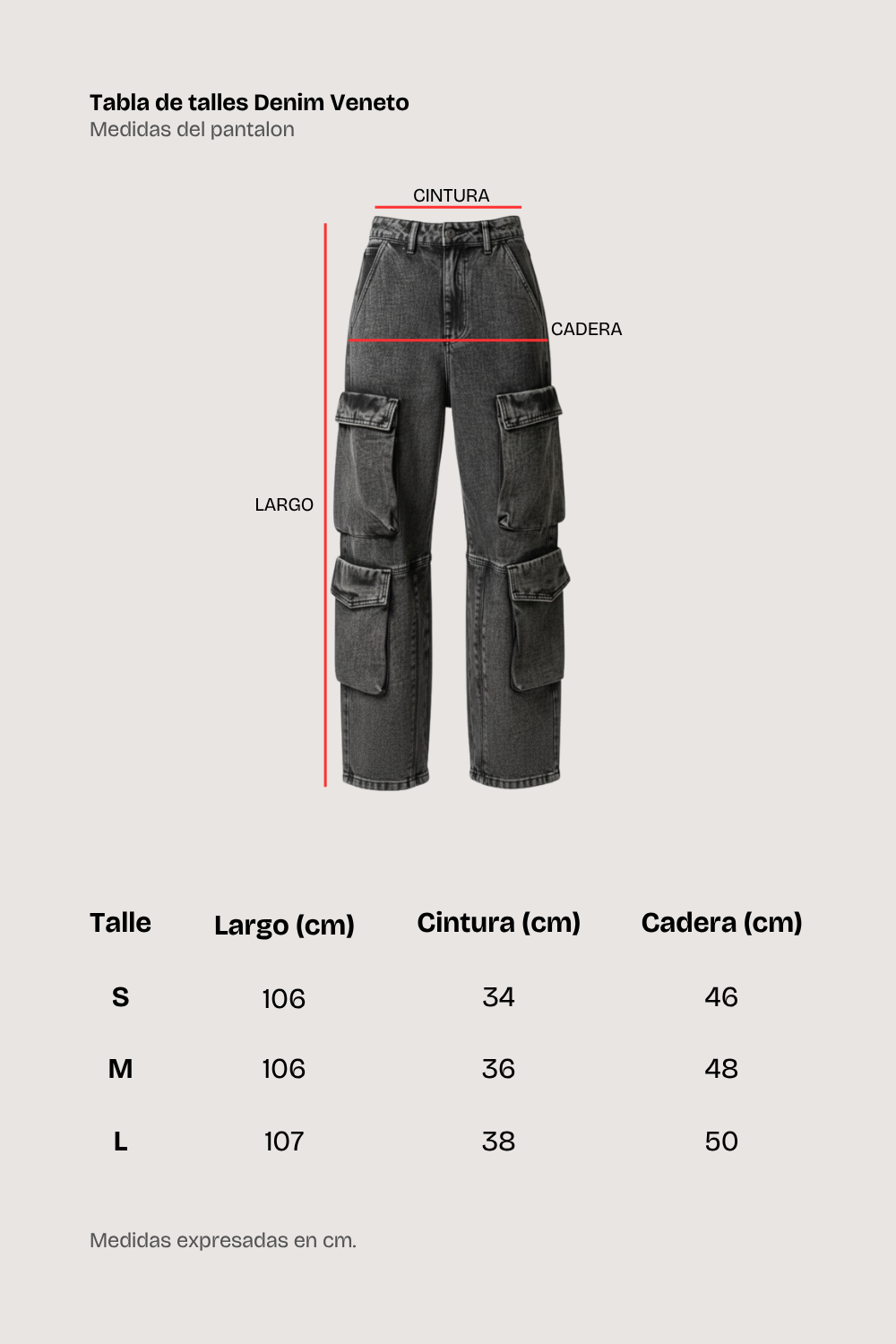 El Pantalón Denim Veneto está confeccionado en denim negro con efecto lavado y textura estructurada. Su diseño cargo de pierna ancha incorpora múltiples bolsillos funcionales y cierres laterales, fusionando estilo utilitario con una silueta moderna y relajada.